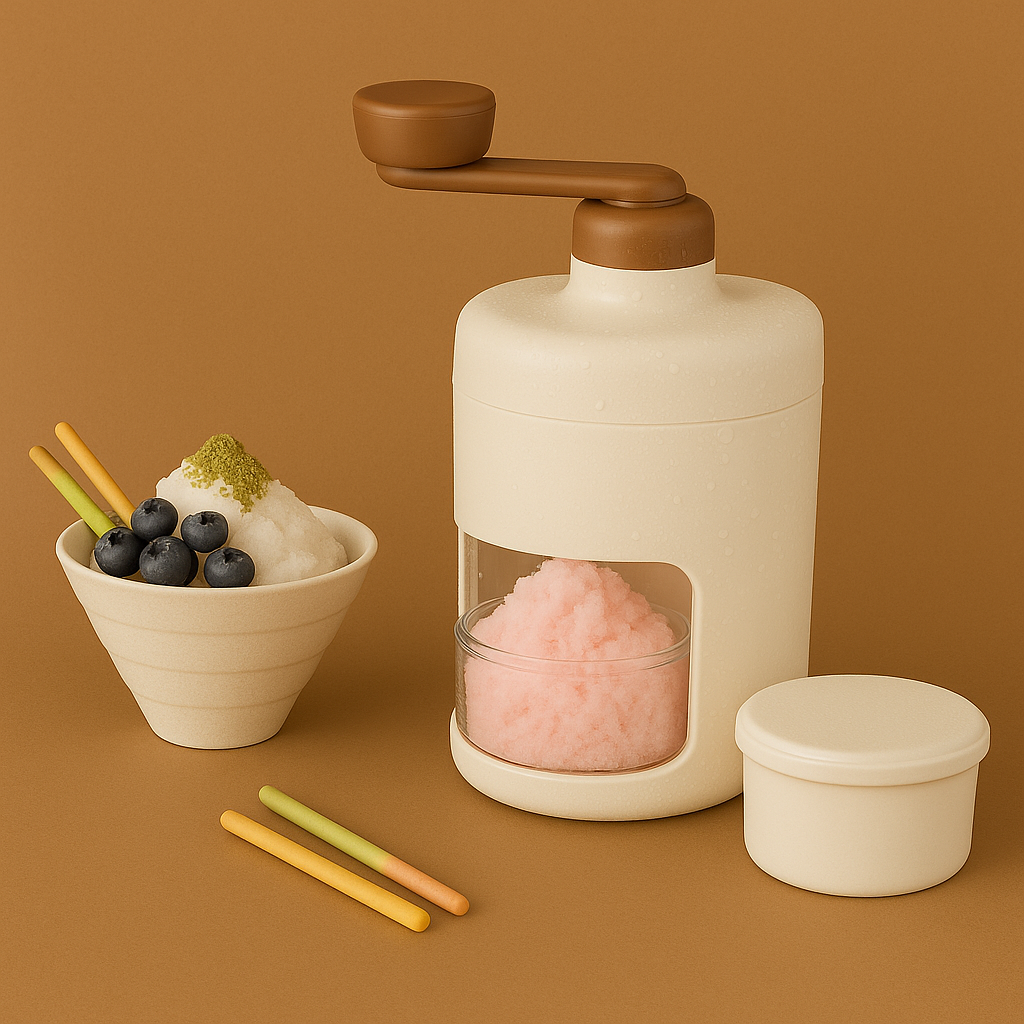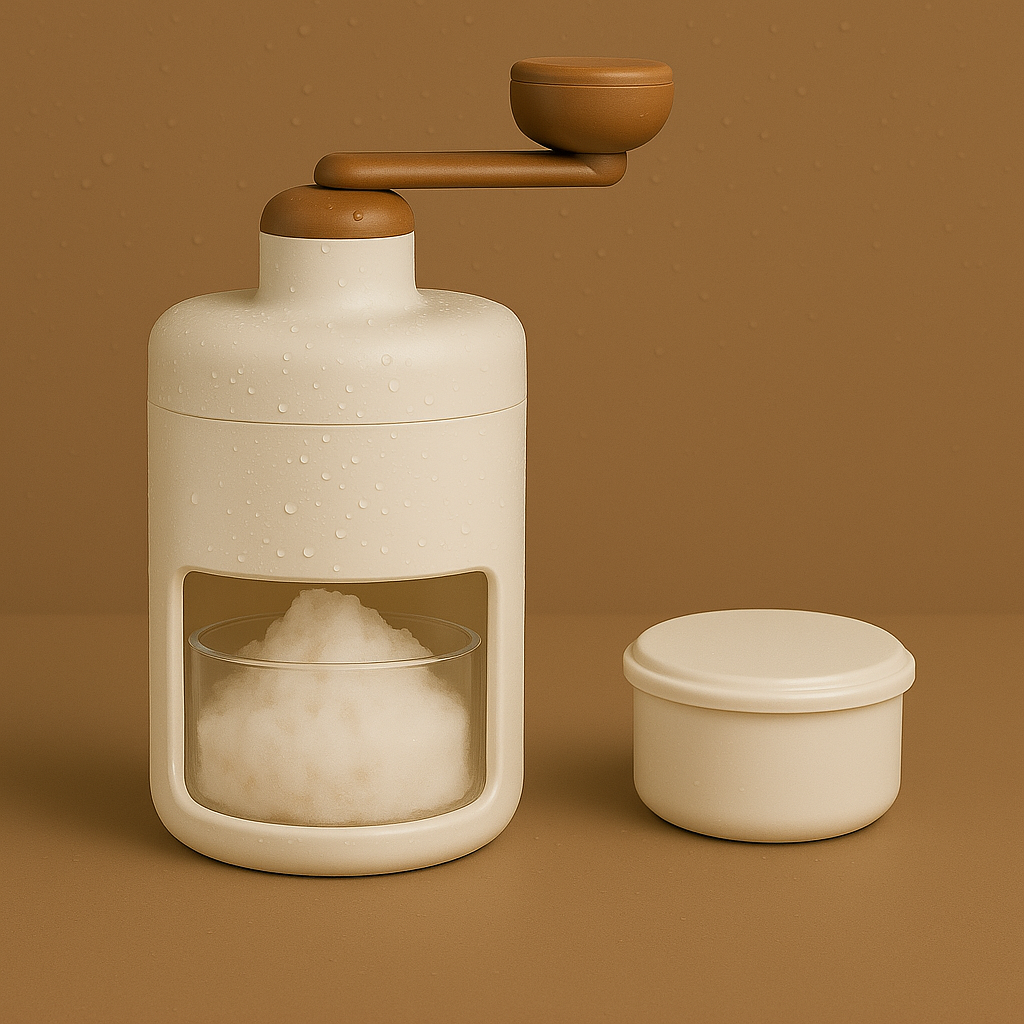 Es wird manuell über eine Handkurbel betrieben. Du gibst gefrorene Masse in den oberen Behälter, drehst die Kurbel, und das zerkleinerte Eis wird im unteren Auffangbehälter gesammelt.