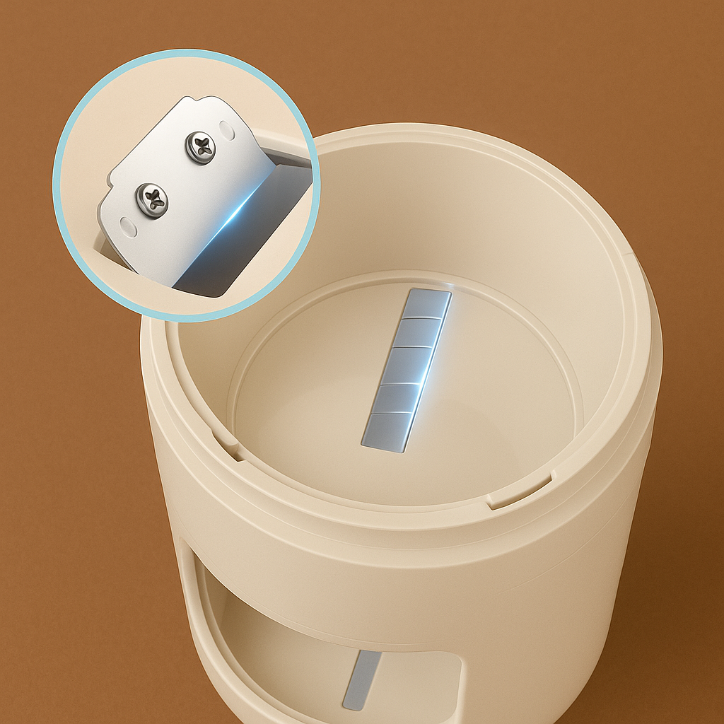 Der Körper besteht aus hochwertigem ABS-Kunststoff, während die Klingen aus verdicktem Edelstahl gefertigt sind. Dies sorgt für Langlebigkeit und effizientes Zerkleinern.