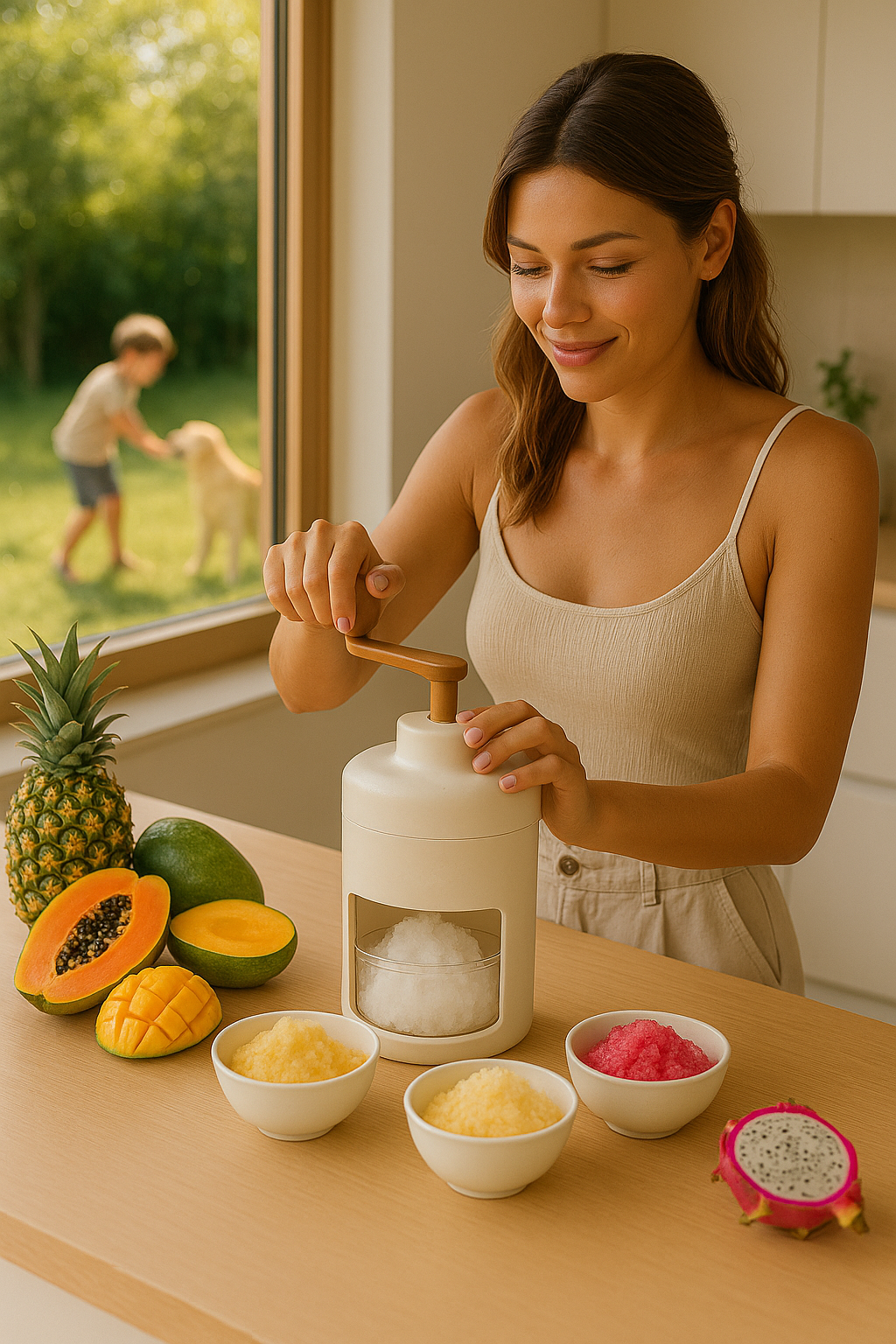 Gieße deine Lieblingsflüssigkeit in den Behälter und friere sie ein. Sobald sie vollständig gefroren ist, gib sie in die Eismaschine. Drehe den Griff und beobachte, wie sie cremig wird. Sofort genießen oder im Gefrierschrank aufbewahren.